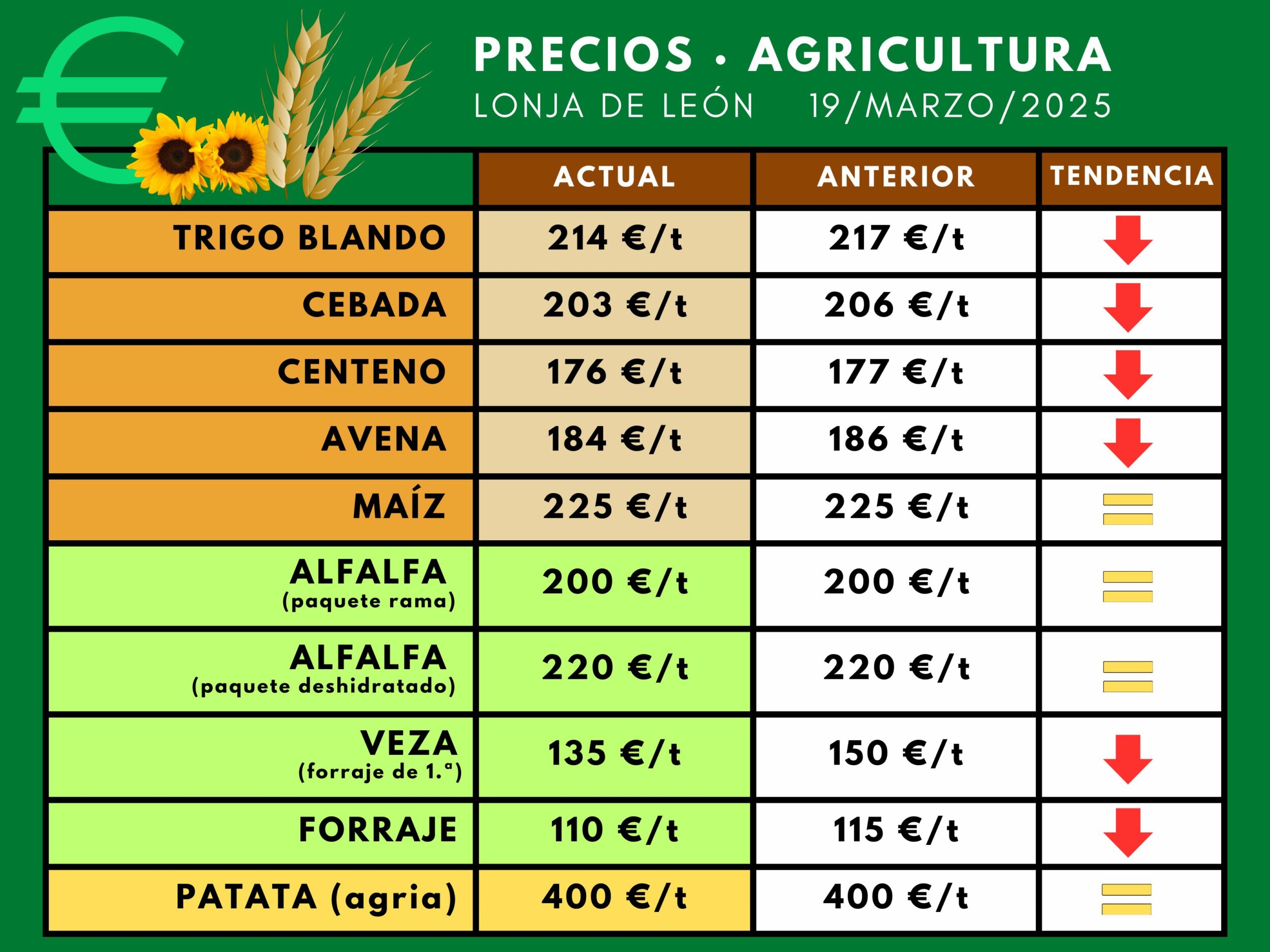 La Lonja de León ha marcado esta semana una nueva bajada de los cereales (a excepción del maíz, que repite). El grano acusa la guerra de los aranceles desatada tras la llegada de Trump a la Casa Blanca, así como la «importante revalorización» del euro frente al dólar, que hace menos competitivas las producciones comunitarias en los mercados internacionales, según explican desde la lonja leonesa, donde también bajaron vezas y forrajes.
