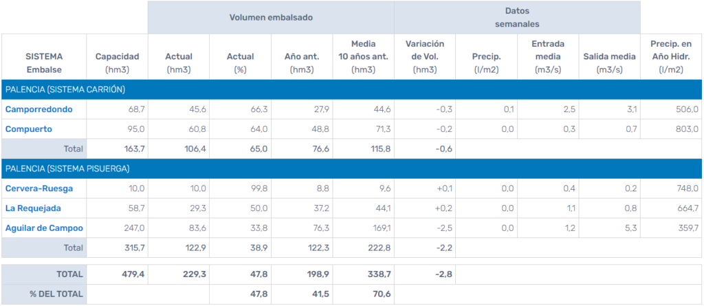 Las lluvias de finales de primavera han amortiguado en parte los bajos niveles que arrastraban de meses anteriores los embalses de los dos sistemas de la provincia de Palencia, pero la perspectiva es diferente en el Carrión y en el Pisuerga, donde continúa siendo preocupante. En este caso, los tres embalses (Cervera-Ruesga, La Requejada y Aguilar de Campoo) llegan a julio con una escasez muy similar al del pasado año por estas mismas fechas, con reservas por debajo de los 123 hectómetros cúbicos, lejos de la media de la última década (223 hectómetros) a estas alturas de año. Mejores cifras presentan los embalses del sistema Carrión (Camporredondo y Compuerto), que entran en julio con 106 hectómetros cúbicos, sensiblemente superior a los niveles del pasado año, que ya vienen sobrepasando desde hace más de un mes.