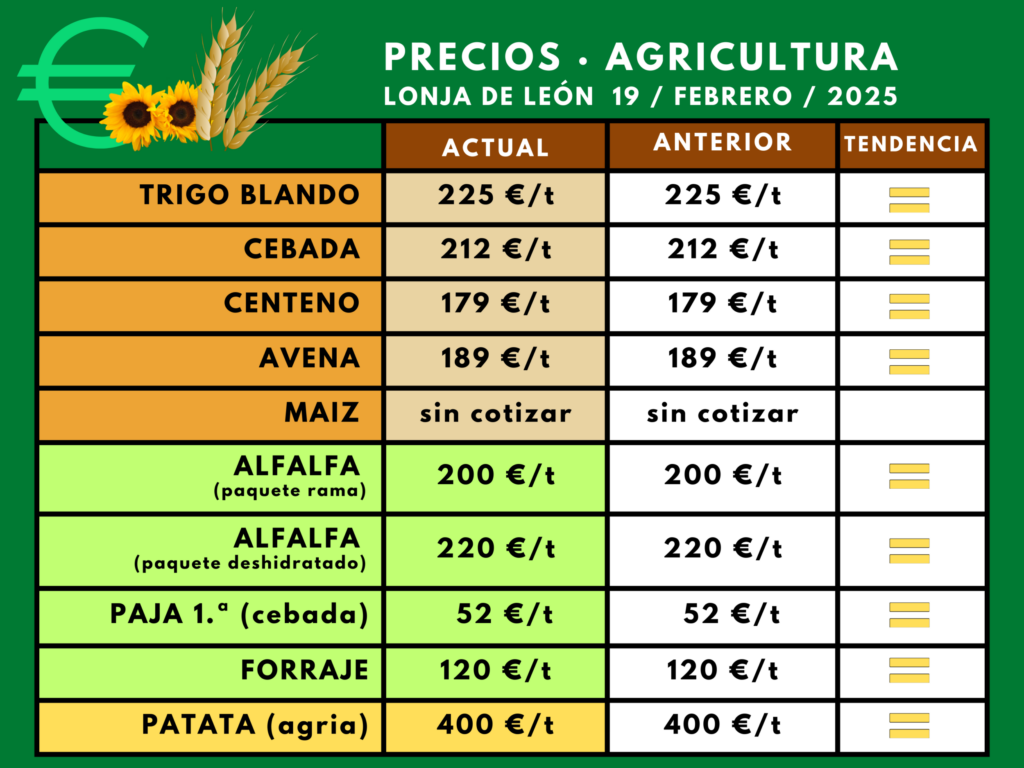 La lonja leonesa añade que, en todo caso, hay gran incertidumbre en los mercados por el reciente giro geopolítico mundial, puesto que «las negociaciones entre Trump y Putin para alcanzar una paz en Ucrania no acaban de convencer, puesto que deja fuera de la negociación tanto a la Unión Europea como al propio presidente ucranio Zelenski, además de querer imponer un cambio de paz por materias primas que Ucrania no está dispuesta a ceder».