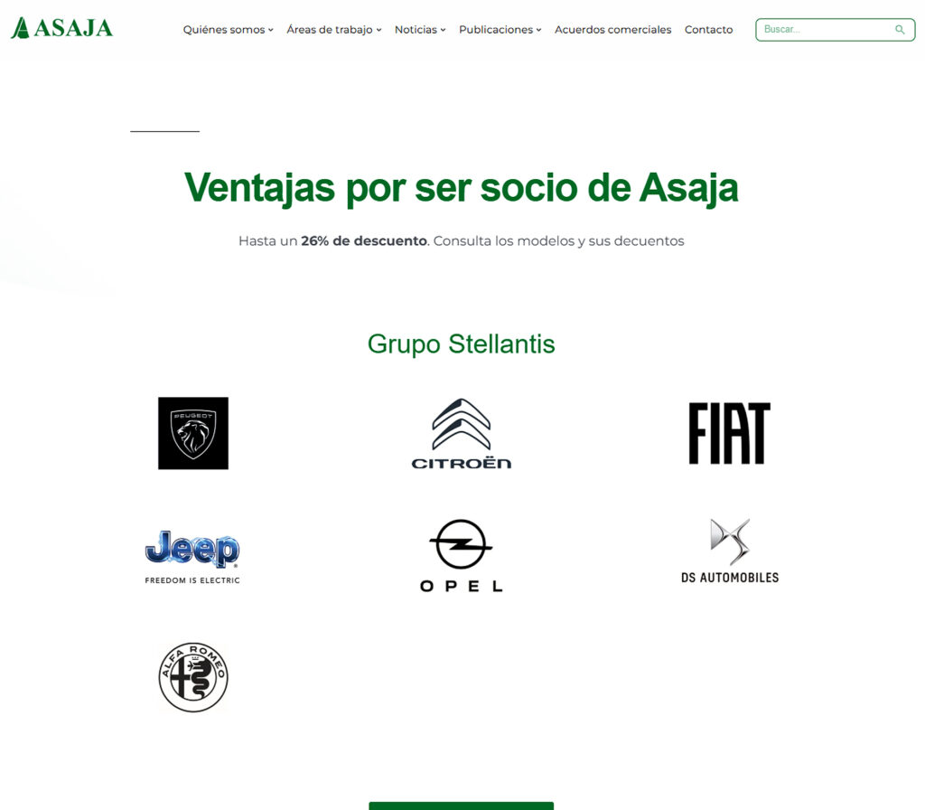 Los socios de ASAJA pueden acceder a descuentos exclusivos, que pueden alcanzar hasta el 26,5 %, en la compra de vehículos del grupo Stellantis. Las siete marcas incluidas en el acuerdo de nuestra organización con este grupo (fruto de la unión en 2021 del francés PSA Groupe y del italo-estadounidense Fiat Chrysler Automobiles) son Citroën, Peugeot, Opel, Fiat, Alfa Romeo y SD Automobiles.