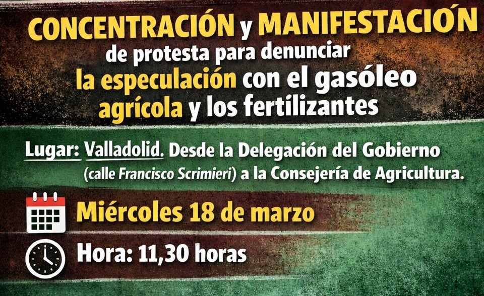 Las OPAs convocan a los agricultores y ganaderos de Castilla y León a concentrarse a las 11,30h junto a la Delegación del Gobierno (al lado de la Cúpula del Milenio de la capital vallisoletana), para denunciar la especulación creciente en los precios del carburante agrícola y también de los fertilizantes, en un momento crítico para la actividad del campo de Castilla y León.