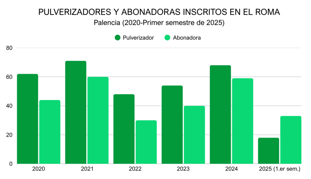 Ese 2021 coincidió, precisamente que fue el año con más máquinas de ambos tipos en un solo ejercicio: 71 pulverizadores (por encima de los 68 del pasado año 2024) y 60 abonadoras, un récord que a punto estuvo de alcanzarse también en el último ejercicio (59).