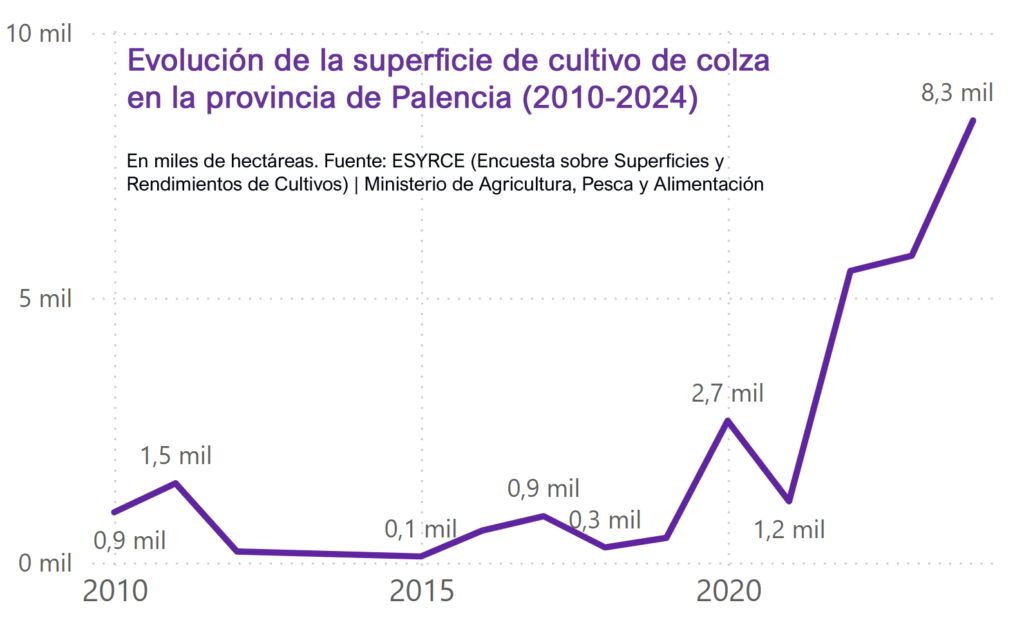 Aunque minoritaria en Palencia, esta oleagionosa ha ganado presencia las últimas campañas. Según datos del Ministerio de Agricultura, en 2024 se sembraron en el campo palentino 8350 hectáreas de colza.