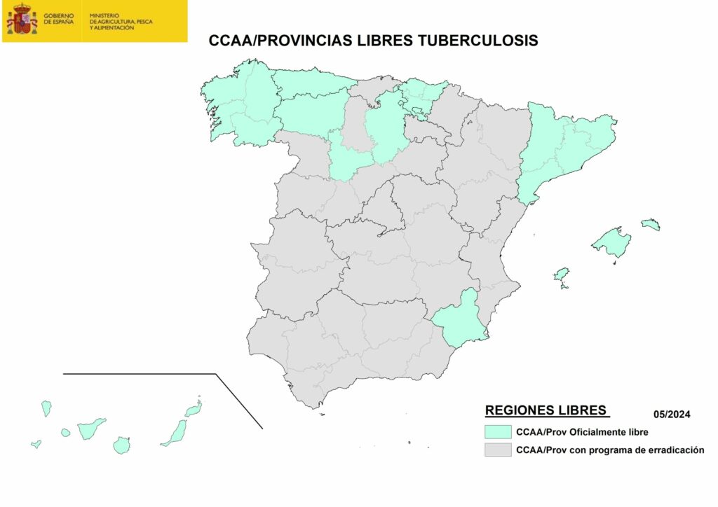 Como se aprecia en el segundo mapa adjunto, Palencia no es una de las provincias de España declarada el pasado año 2024 libre de tuberculosis bovina (al contrario que Burgos, León y Valladolid; en color turquesa), sino que sigue aplicándose el programa de erradicación (color gris).