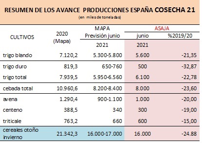 La Sectorial de Cereales de ASAJA reunida hoy en Madrid ha cifrado la cosecha de nacional cereales de este año en 16 millones de toneladas. Esto supone un significativo descenso de producción respecto al año pasado, cuando se alcanzaron los 21,3 millones de toneladas, según datos oficiales del ministerio de Agricultura. En suma, un recorte productivo que ronda el 25 por ciento.