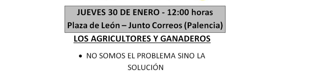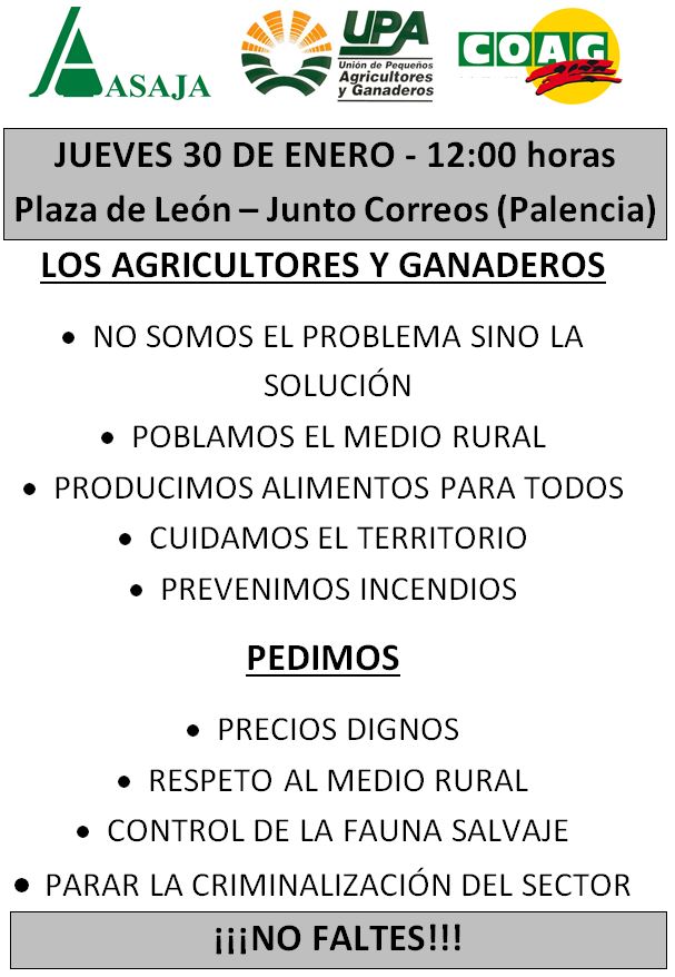 “En defensa de su futuro” los agricultores y ganaderos de toda la provincia, convocados por ASAJA, COAG y UPA, inician mañana jueves 30 de enero, a partir de las 12.00 horas en Palencia, en la Plaza de León (junto a Correos) una manifestación para denunciar la grave situación de falta de rentabilidad que atraviesan sus explotaciones y el hartazgo ante los ataques que están recibiendo.