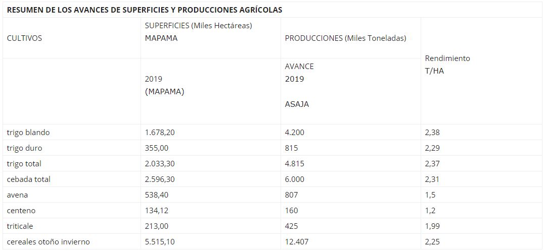 Según los cálculos de ASAJA, la cosecha de cereales se verá reducida en un 37% respecto a la cosecha recogida en 2018. Por cultivos, se espera una producción de 4,2 millones de toneladas en trigo blando; 815.000 toneladas en trigo duro; 6 millones de toneladas en cebada; 807.000 toneladas de avena; 160.000 toneladas de centeno y 425.000 toneladas de triticale. (Según datos recogidos en el cuadro de más abajo).