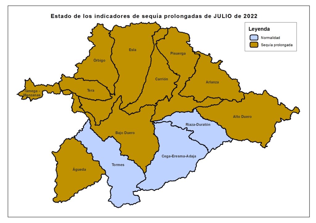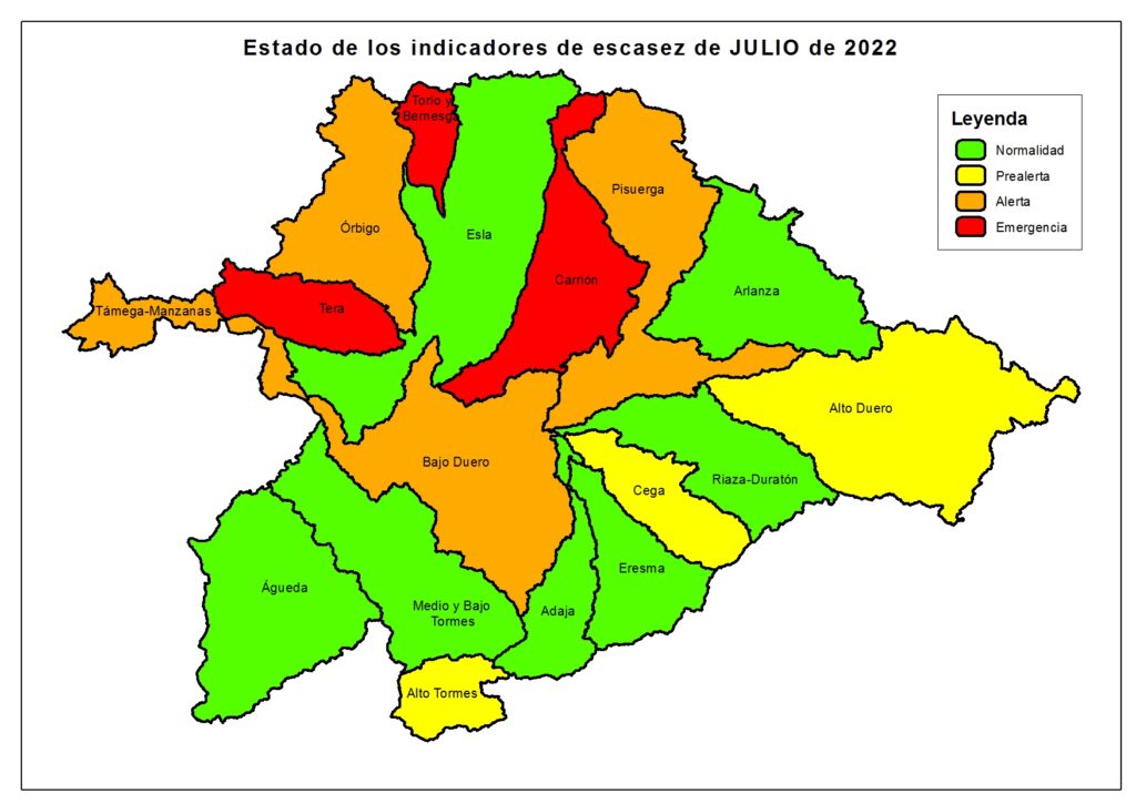 Se acaba de publicar el «Informe Mensual de Seguimiento del Plan Especial de Sequía» del mes de julio. En estos informes, la CHD estudia la escasez de agua y la situación de sequía prolongada. Los datos del mes de julio hacen que el sistema Carrión, en el índice de escasez, haya pasado a «emergencia», el más grave de todos (normalidad, prealerta, alerta y emergencia), mientras tanto el sistema Pisuerga continúa en «alerta» aunque se ha quedado al borde de la «emergencia». Lógicamente, ambos sistemas se mantienen en la situación de «sequía prolongada» un mes más y es que ya en junio se declaró la «situación especial por sequía extraordinaria» en ambos sistemas.