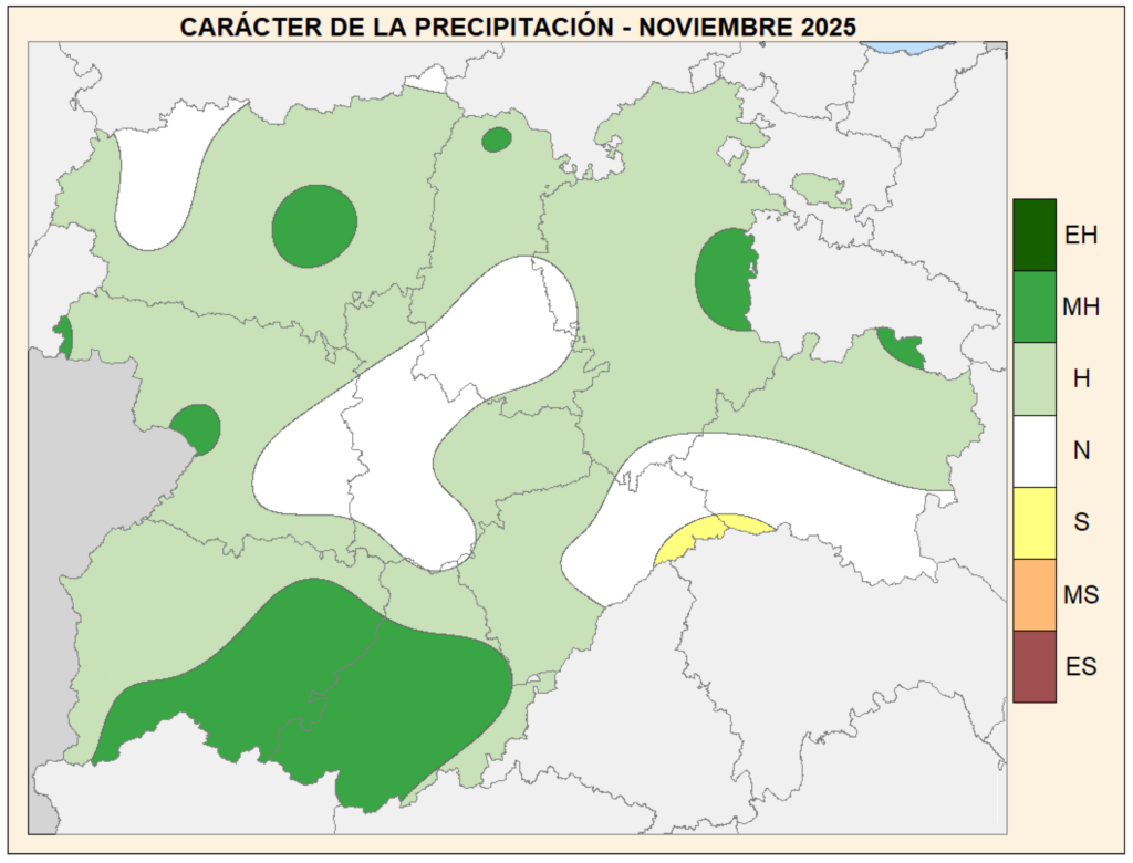 Según se aprecia en el mapa facilitado por la delegación territorial de la Agencia Estatal de Meteorología (Aemet) en Castilla y León, noviembre fue un mes húmedo (H, color verde claro) en la provincia de Palencia, salvo una franja casi coincidente con Tierra de Campos.