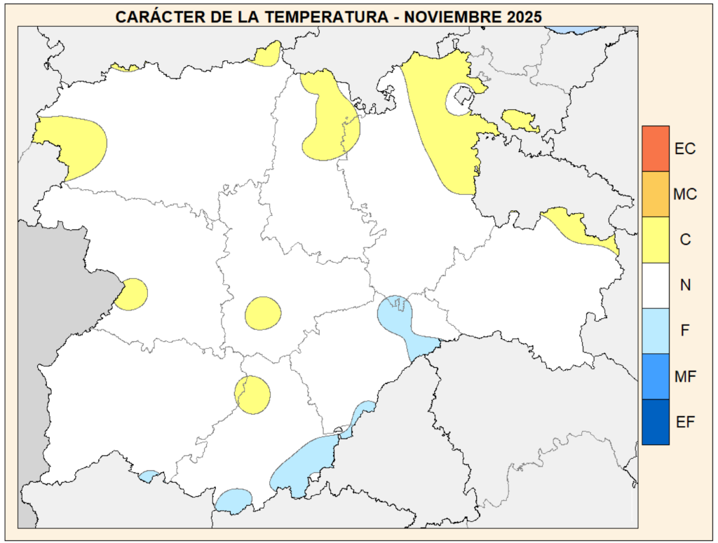 Tan sólo en el cuadrante noreste del territorio palentino se aprecian unas temperaturas algo más cálidas (C, color amarillo) de lo que cabe esperar para un noviembre en nuestra provincia, como también ha sucedido en Burgos.