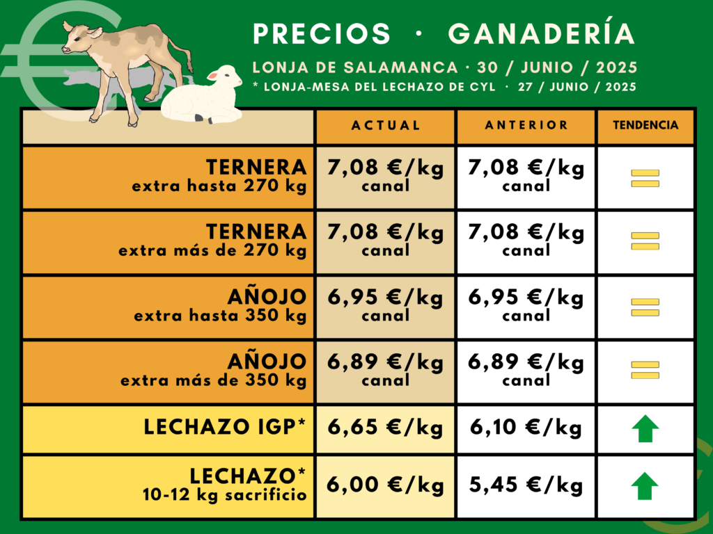 Mientras estas categorías se muestran estables, las de erales, toros, novillos y vacas reafirmaron su tendencia alcista, con una nueva subida de tres céntimos por kilo en las canales.
