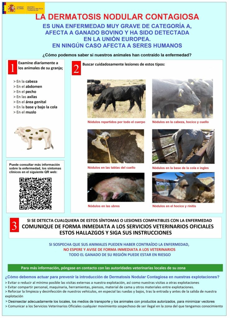 El Ministerio de Agricultura, Pesca y Alimentación (MAPA) ha informado que los servicios veterinarios oficiales de la Generalitat de Catalunya y el Laboratorio Central de Veterinaria de Algete han confirmado la presencia de la dermatosis nodular contagiosa (DNC) en una segunda explotación en España. Se trata de una granja de bovino de Perelada (Gerona), con 270 cabezas, dedicada a reproducción para producción láctea. La DNC no infecta al ser humano ni por contacto con animales enfermos ni por consumo de productos, pero constituye una nueva amenaza para la sanidad ganadera que puede acarrear muchos problemas, ya exige —entre otras medidas— sacrificar todos los animales de la explotación afectada, además restringir en un área circundante los movimientos de ganado y de sus productos.