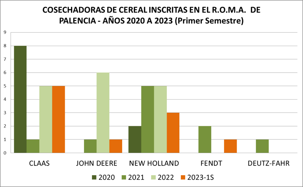 En el caso de las cosechadoras de cereal nuevas, Claas ha conseguido igualar las ventas de todo 2022 en este primer semestre, habiendo adquirido los agricultores palentinos cinco unidades. New Holland también destaca, con tres unidades vendidas mientras que John Deere y Fendt han conseguido la venta de una unidad cada marca. Por su parte Deutz-Fahr no ha sido capaz de vender ninguna de sus cosechadoras en Palencia. El total de unidades vendidas en el primer semestre ha sido de 10, las mismas que se vendieron en todo el año 2020 e igualmente en todo el año 2021. En el año 2022 fueron 16 las cosechadoras de cereal que se vendieron.