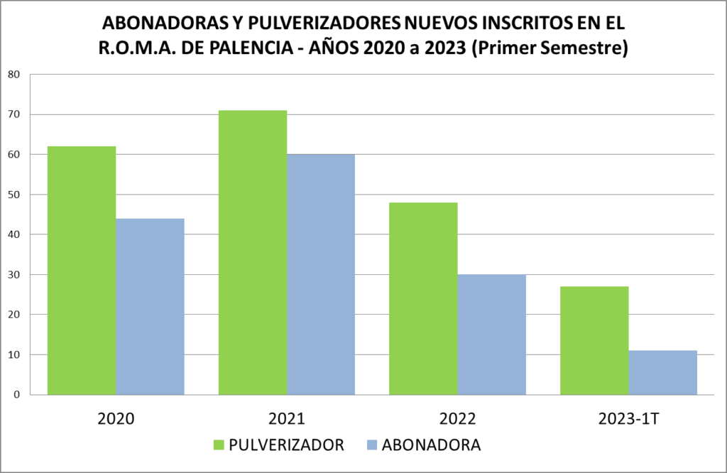 Las máquinas de obligatorio registro en el R.O.M.A. son las abonadoras y pulverizadores. Su inscripción en dicho registro está muy marcada por la publicación de las ayudas del Plan Renove, que este año comenzó su tramitación el día 7 de julio, pudiendo inscribirse estas máquinas en los últimos días de junio. En el primer trimestre de 2023 se han adquirido 27 pulverizadores y 11 abonadoras, es decir, un total de 38 máquinas. Éste es un número relativamente bajo ya que en todo el pasado año se compraron 78 máquinas de este tipo y en los años 2020 y 2021 se vendieron 106 y 131 unidades respectivamente, muy por encima de los datos actuales, aunque faltan los datos del segundo semestre de este año 2023.