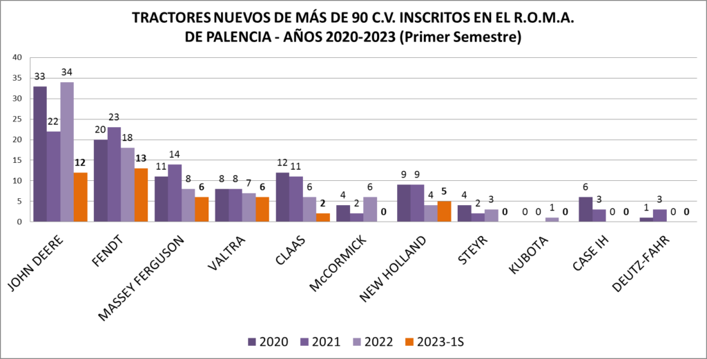 Según los datos del Registro de Maquinaria Agrícola (R.O.M.A.), en el primer semestre de 2023 sólo se han producido ventas de tractores nuevos pertenecientes a seis marcas comerciales. La que ha conseguido la mayor venta de unidades ha sido Fendt, con 13 tractores, seguida por John Deere, con 12 unidades vendidas. A continuación se encuentran Massey Ferguson y Valtra, de las que se han vendido 6 tractores, New Holland, con 5 tractores vendidos, y Claas, que ha vendido dos tractores. El total de tractores vendidos en el primer semestre de 2023 ha sido de 44 mientras que en el año 2020 se vendieron 108 tractores, en 2021 fueron 97 los tractores vendidos y el pasado año 2022 han sido 87 las unidades vendidas. En cuanto a las importaciones, ocho han sido los tractores que han venido a España con una edad inferior a los diez años.