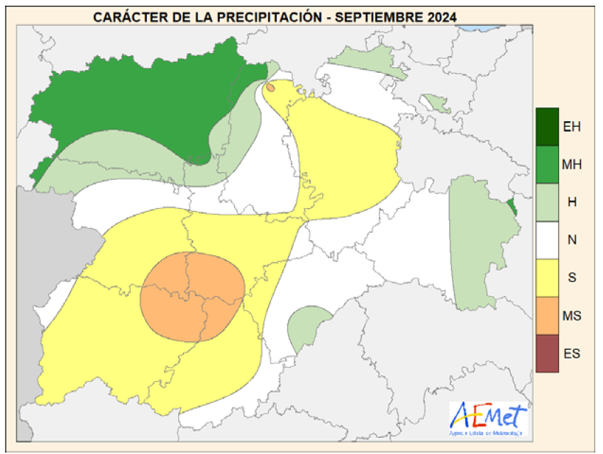 Septiembre ha sido un mes frío (F) en Palencia en relación con lo habitual, e incluso muy frío (MF) para esta época del año en algunas áreas del noroeste provincial, según la Agencia Estatal de Meteorología (AEMET). En cuanto a las precipitaciones, ha sido normal (N) en la mayoría del territorio palentino, si bien se ha mostrado más seco (S) de lo que corresponde a septiembre en La Valdivia, aun cuando en la estación de Lomilla de Aguilar que gestiona el ITACYL se midieron cerca de 77 litros por metro cuadrado a lo largo del mes.