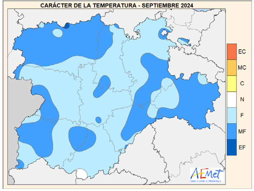Según la AEMET, el mes de septiembre ha sido muy frío en las zonas del noroeste y del este de Castilla y León, así como en áreas localizadas de Zamora, Salamanca y Palencia (también en su parte más noroeste, las comarcas de Guardo y Saldaña, así como en la zona de los montes Torozos, en el suroeste palentino). En el resto de la comunidad y de nuestra priovincia, ha sido un mes frío para lo que corresponde a este mes. En muchas localidades de Castilla y León se ha registrado, de hecho, la temperatura media más mensual más baja de su historia para un mes de septiembre.