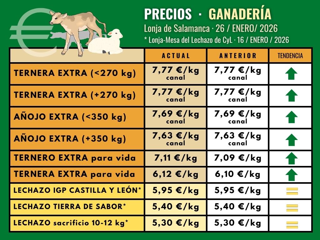 El resto de precios de vacuno repiten las cotizaciones de la semana pasada, tanto en ternera extra (de más y menos de 270 kilos) como en añojo (de más y menos de 350 kilos).
