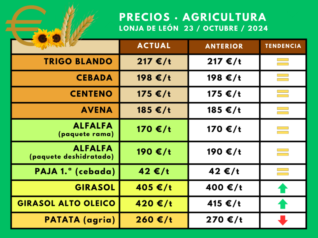El girasol ha registrado esta semana en la Lonja de León una tímida subida de cinco euros por tonelada, tanto en el convencional como en el alto oleico, debido a las estimaciones de menor cosecha mundial. Asimismo, las condiciones atmosféricas han complicado la campaña de recogida en diversas zonas de España —como en la provincia de Palencia— y en otros países europeos, como Francia, uno de los principales productores y exportadores del territorio comunitario. Por su parte, los cereales repitieron cotización esta semana, mientras la patata baja una sesión más, por la presión de una oferta necesitada de venta rápida si el agricultor carece de medios de almacenamiento y conservación.