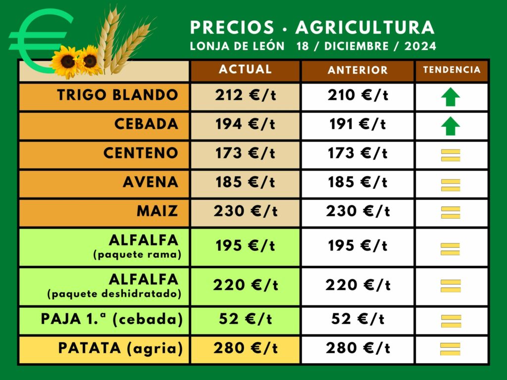La Lonja de León ha reflejado este miércoles, 18 de diciembre, una tímida reacción del mercado del cereal, que se ha traducido en unas subidas de tan sólo dos euros en la tonelada de trigo y de tres euros en la de cebada. La Lonja de Salamanca ya había apuntado el lunes esa tendencia, con alzas de un euro en todos los cereales de invierno, salvo la cebada, que subió dos. Los forrajes no han cotizado esta semana en León y la patata mantiene los precios de la anterior.