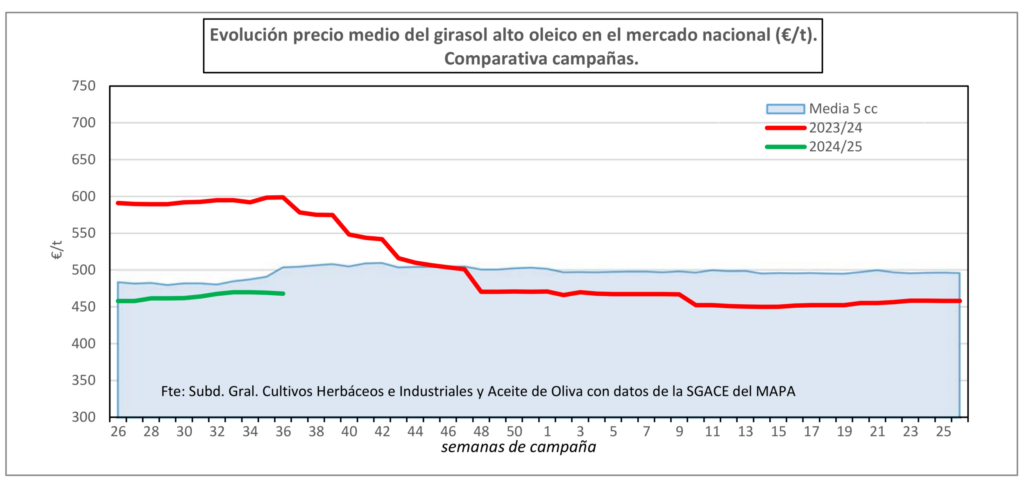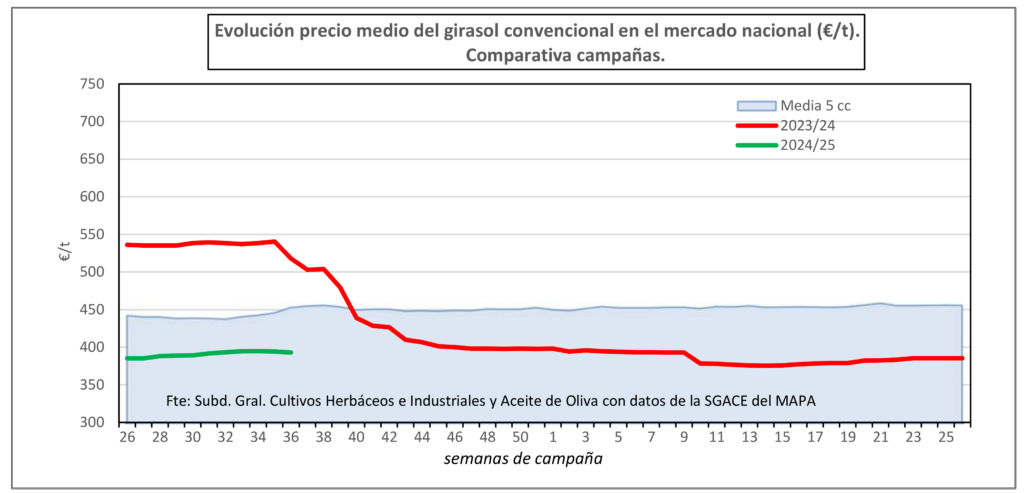 La Lonja de León dio su primera cotización del girasol en la pasada campaña el 27 de septiembre (entonces se marcaron 375 euros/tonelada, diez más en el alto oleico), pero el Observatorio de Precios de Castilla y León ya constató en esta nueva campaña, en la semana 37 (9-15 de septiembre) operaciones a 385 euros/tonelada (tras subir desde los 366 €/t del arranque de temporada); y hay mercados de la región donde se rondaban a mediados de este septiembre los cuatrocientos euros por tonelada.