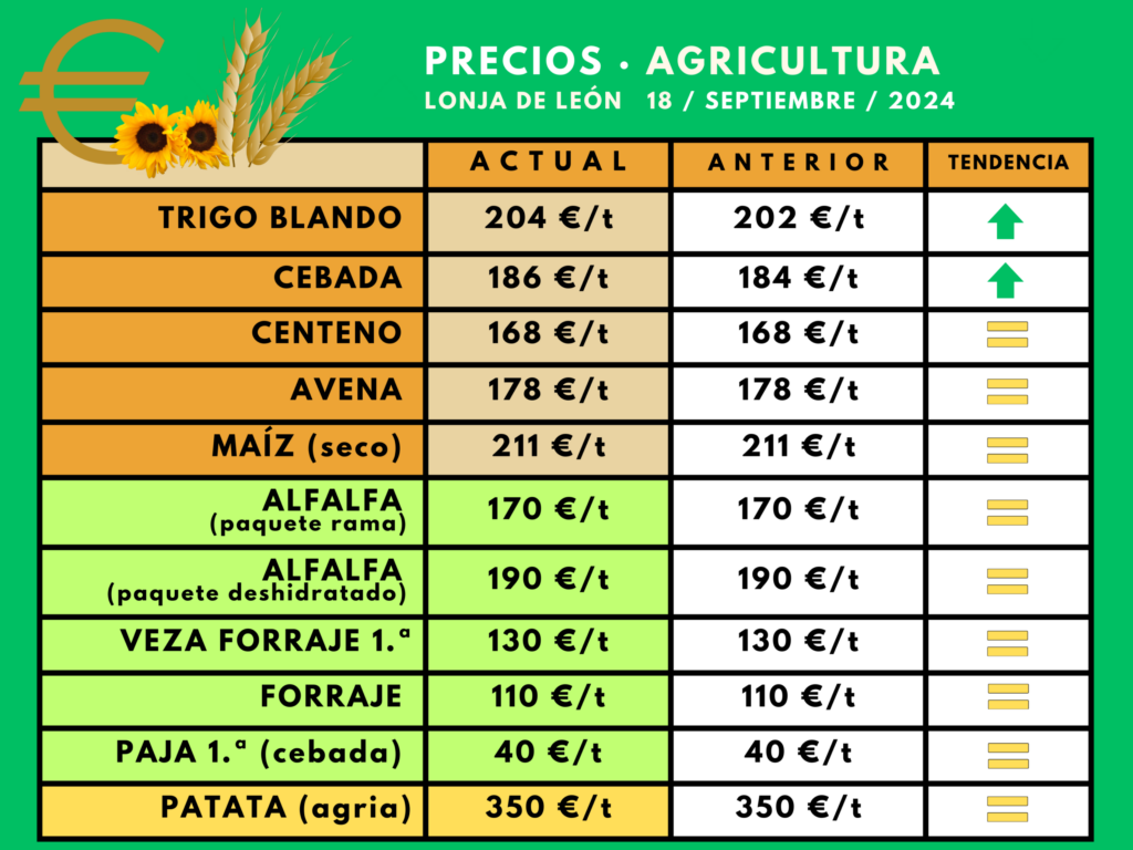 La mesa de cereal de la Lonja de León celebrada este miércoles, 18 de septiembre, ha repetido precios salvo sendas subidas de sólo dos euros por tonelada en el trigo y la cebada. Esos retoques, más tímidos de los esperados hace una semana, se deben a que a comienzos de la actual «la tendencia volvió a ser negativa en los mercados internacionales y esto ha condicionado la cotización, al imponerse la cautela», según explican desde la lonja leonesa. Su primer precio del girasol para esta campaña ya no tardará, puesto que ese mercado empezó a cotizar la anterior el 27 de septiembre.