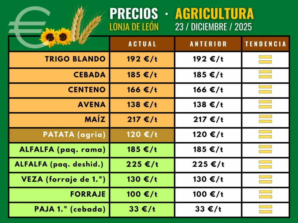 Desde la lonja leonesa (que adelantó la sesión al martes, al caer en miércoles la Nochebuena) constatan que todo el grano permanece estable, hundido en su nivel incompatible con la rentabilidad considerando los altos costes de producción actuales y un escenario de rendimientos normales, como señalan informes recientes (sin ir más lejos, el de la Universidad de Valladolid para la Consejería de Agricultura, Ganadería y Desarrollo Rural de la Junta de Castilla y León).