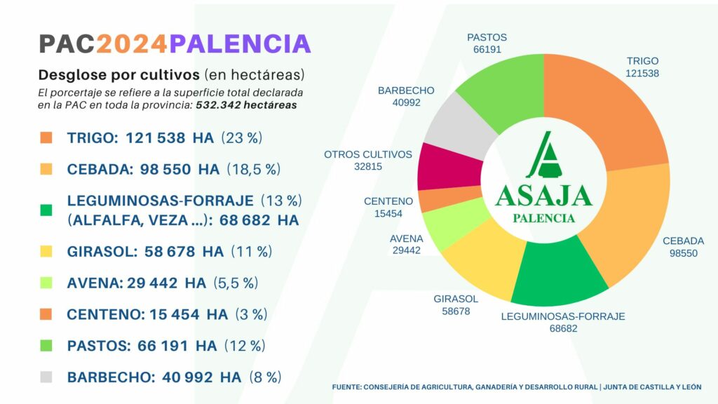 De la paulatina diversificación de la agricultura en nuestra provincia da idea que todos los demás cultivos no mencionados suponen más de 32 800 hectáreas, superficie que sobrepasa la destinada a cereales de tradición en Palencia, como la avena o el centeno; y que sólo se ve superada por los cereales dominantes (trigo y cebada), las forrajeras y el girasol (además de las superficies de pastizal y barbecho, que prácticamente suponen una quinta parte de la superficie total declarada en la PAC 2024)./