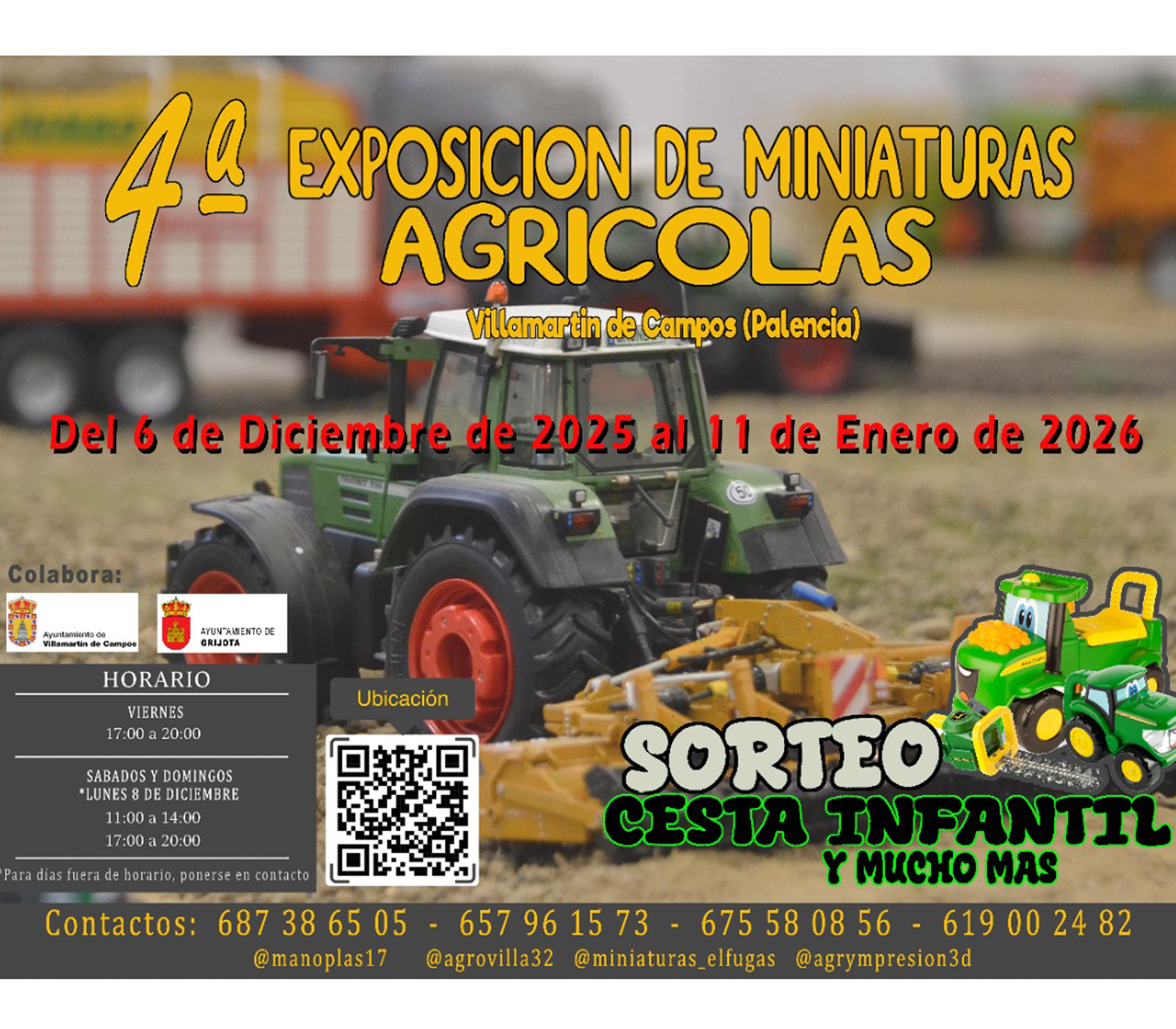 Villamartín de Campos acoge desde este sábado, 6 de diciembre, hasta el domingo 11 de enero de 2026 la cuarta edición de la Exposición de Miniaturas Agrícolas, que reúne más de trescientas maquetas a escala 1/32 que recrean la vida del campo, con una especial atención a las labores agroganaderas. Aquí te contamos los horarios y los detalles de una muestra para todos los públicos, que en pocas ediciones se ha convertido en una atractiva visita en estas semanas del tramo final del otoño y el inicio del invierno, que ofrece una amena alternativa de ocio para este largo fin de semana de la Constitución y la Inmaculada, y para los fines de semana de las próximas navidades.