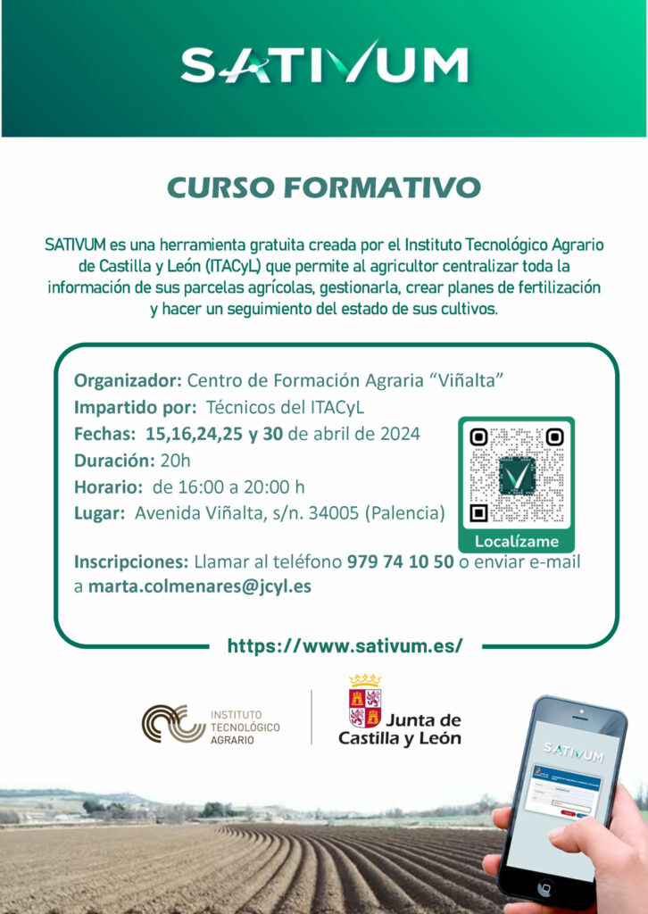 El Centro de Formación Agraria Viñalta, situado en la ciudad de Palencia, imparte un curso de veinte horas sobre Sativum, la herramienta informática gratutia creada por el Instituto Tecnológico Agrario de Castilla y León (ITACyL), que permite al agricultor centralizar toda la información de sus parcelas y cultivos. Técnicos del ITACyL impartirán este curso los días 15, 16, 24, 25 y 30 de este mes de abril en sesiones vespertinas (16:00-20:00 horas).