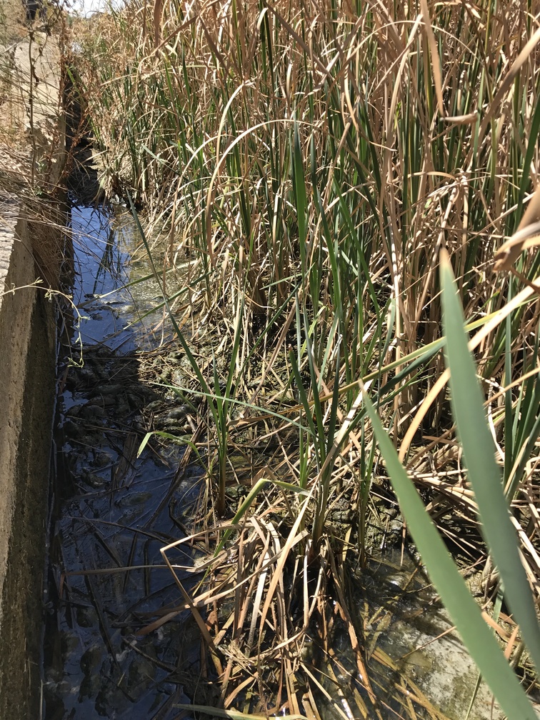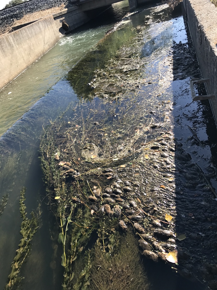 Río Valdeginate (05/09/2019). Cadáveres de topillos flotan en el río mientras se descomponen. Se puede observar la absoluta falta de limpieza del río pese a lo que se ha transmitido por parte de la CHD.