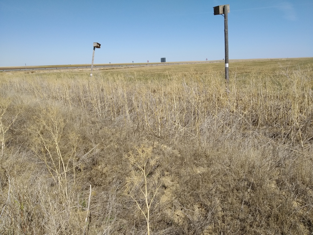 Villarramiel (05/09/2019). Arroyo horadado por multitud de huras de topillo, sobre él dos cajas nido. El rastrojo de cereal tenía alta presencia de huras de topillos.