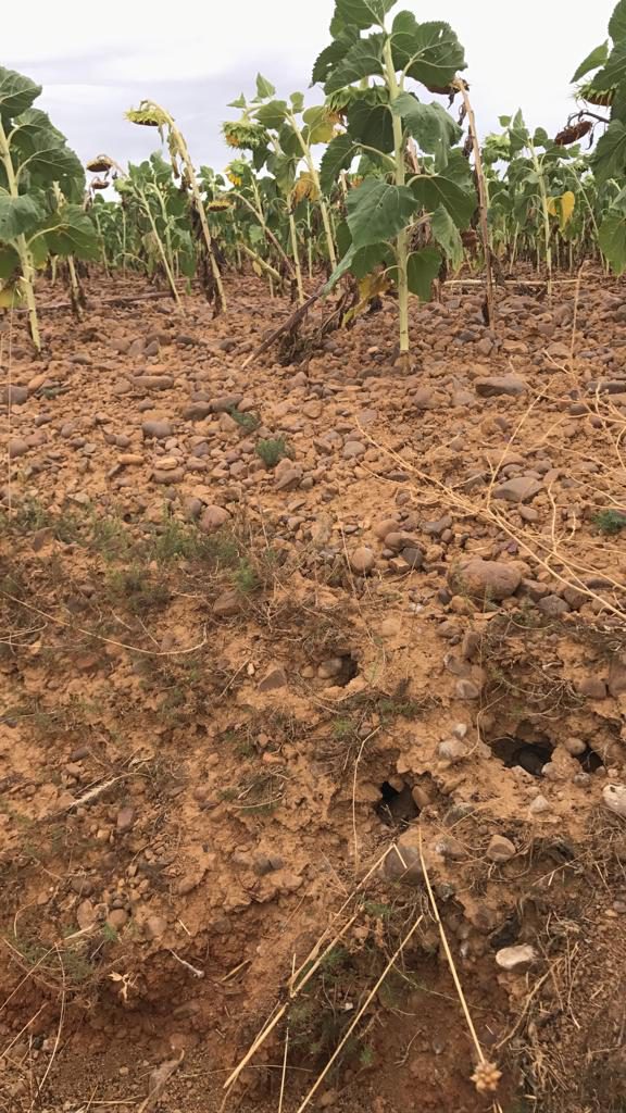 Villanueva del Rebollar (05/08/2019). Huras de topillos en la cuneta bajo los daños que están generando en el girasol.