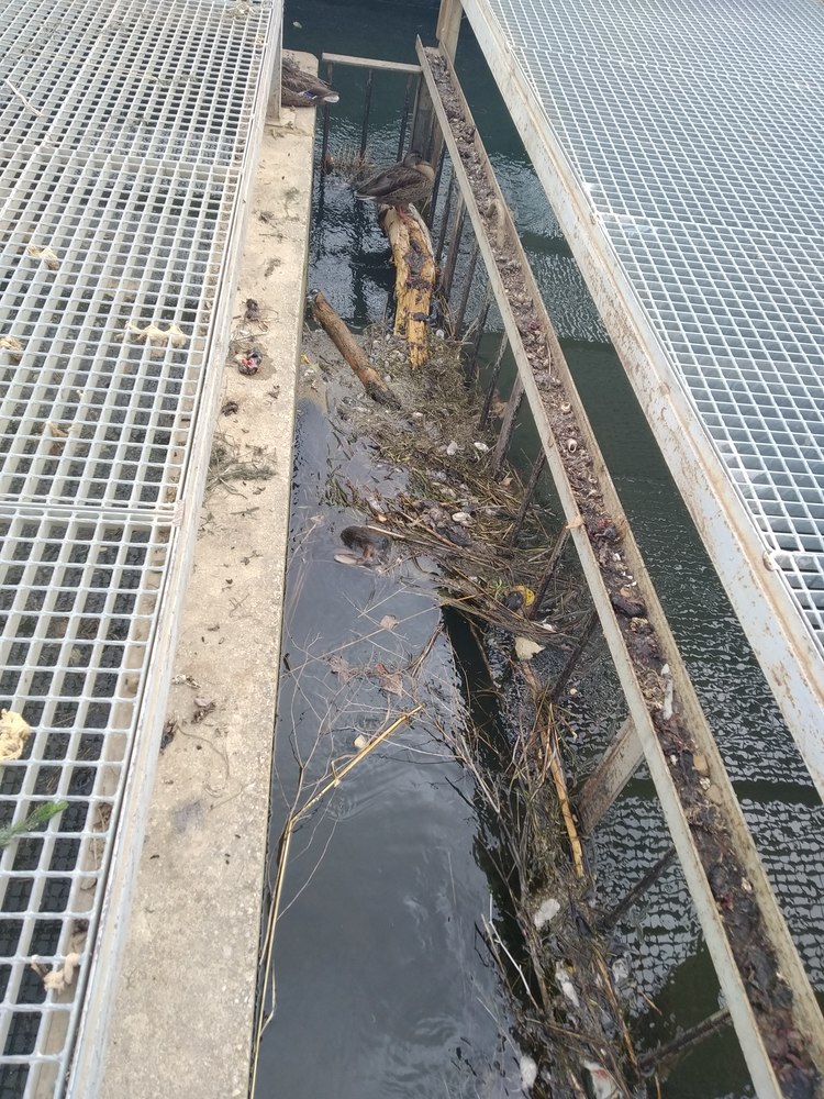 Villalobón (10/09/2019), Canal de Palencia. Topillos en descomposición y multitud de restos de cadáveres en la barra que sobresale del agua. Los patos ven el espectáculo con cierta normalidad.
