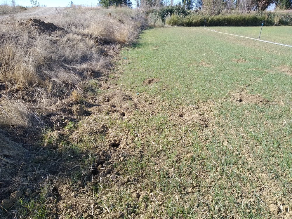 Amusco (05/09/2019). En esta parcela se ha pasado el chísel dos veces, se ha rotocultivado y se ha sembrado de alfalfa diez días antes de tomar la fotografía. Se puede haber acabado con los topillos de la parcela pero la cuneta está llena de huras y rápidamente se introducen en la parcela.