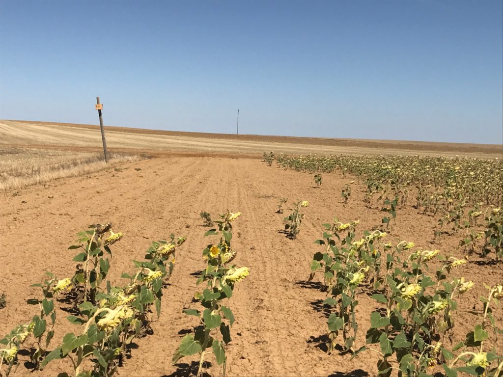 Autillo de Campos (05/09/2019). Fotografía del lugar exacto donde se realizó la presentación por parte de la Consejería de las medidas para erradicar la plaga. El girasol ha sido comido por los topillos en los bordes de la parcela. Cuando se ha pasado la motoniveladora ya no existía población de topillos destacable. Al fondo se pueden ver tres cajas nido.