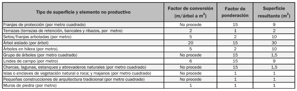 El FEGA recuerda que la superficie resultante es el resultado de aplicar, en primer lugar, un factor de conversión para las geometrías de línea o punto; y en segundo lugar, un factor de ponderación con arreglo a la siguiente tabla: