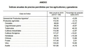 Por ello, el ministerio difunde los valores del índice anual de precios percibidos por los agricultores y ganaderos en 2016 y su incremento respecto al año 2015, tanto para el índice general agrario como para los principales índices de productos.
