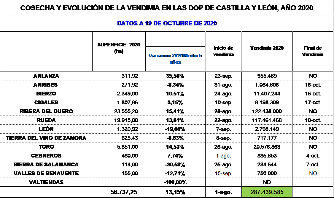 La vendimia 2020 en Castilla y León está a punto de darse por finalizada con un total de 287,5 millones kilos recolectados, lo que representa más de un 12 % de lo vendimiado en 2019. Las denominaciones de origen de Arribes, Bierzo, Cigales, Rueda y Cebreros ya han comunicado oficialmente el final de la vendimia y al resto les queda muy poco para terminar.