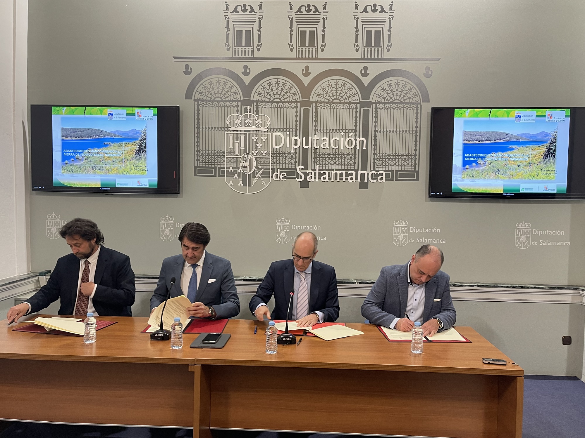 El consejero de Medio Ambiente, Vivienda y Ordenación del Territorio, Juan Carlos Suárez-Quiñones, firmó el 30 de mayo un protocolo general de actuación entre la Junta de Castilla y León, la Diputación de Salamanca, las mancomunidades ‘Sierra de Francia’ y ‘Embalse de Béjar’ y el Ayuntamiento de Béjar para desarrollar el proyecto de abastecimiento a la Sierra de Francia desde el embalse de Navamuño.