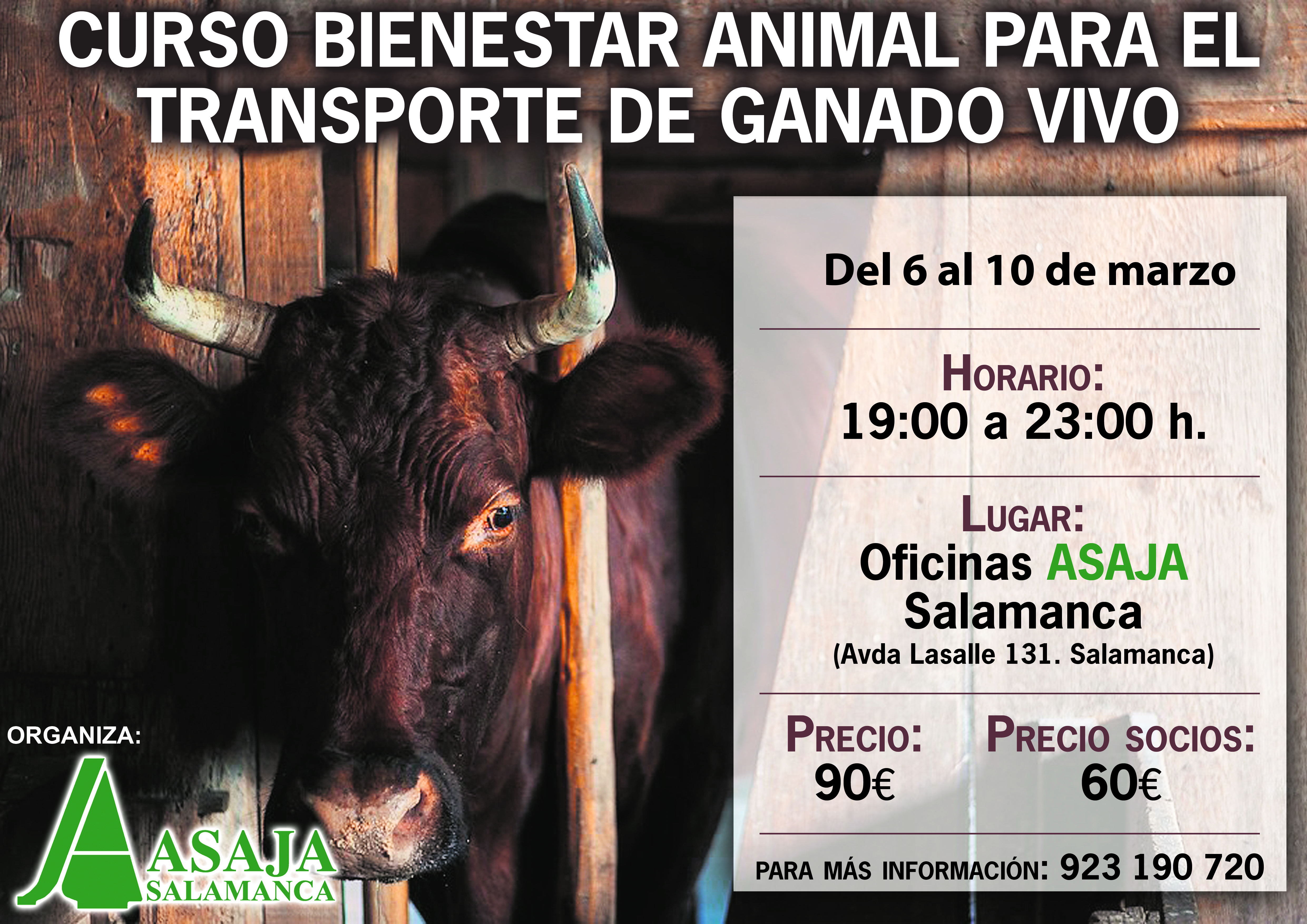 Aún quedan plazas libres para el curso de 'Bienestar animal para el transporte de ganado vivo' que comenzará el lunes 6 de marzo y finalizará el día 10. El horario en que se llevará acabo la actividad formativa es de 19 a 23 horas en las oficinas de ASAJA Salamanca. El veterinario Franciso Javier García será el profesor que imparta la materia.