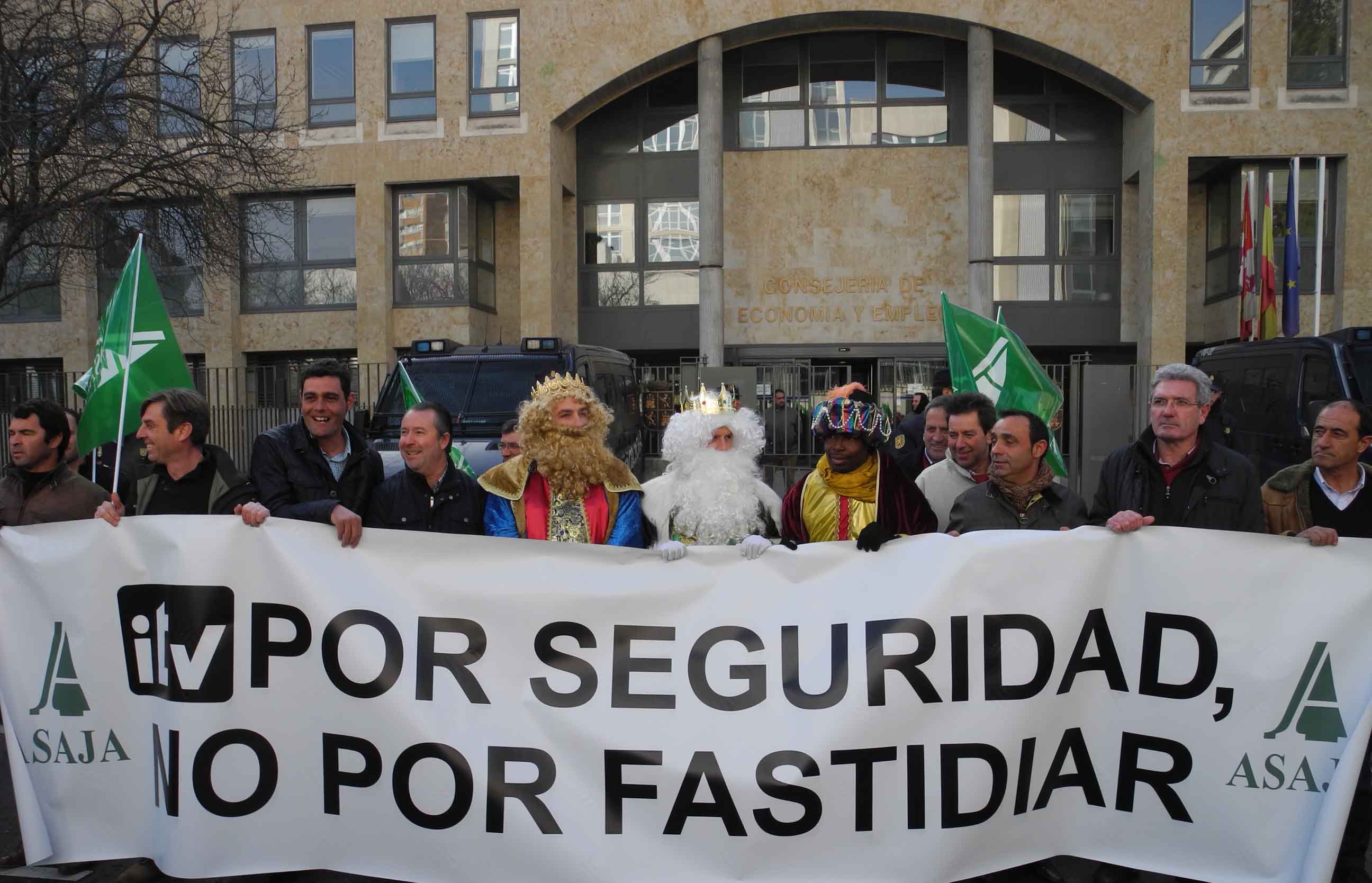 Al frente, los responsables de la organización en la región y en las diferentes provincias mostraban una pancarta con el mensaje: “ITV por seguridad, no por fastidiar”. Una vez frente a la Consejería, se arrojó un cargamento de carbón, y dentro el séquito real hizo entrega en el Registro de una cesta de navidad repleta de carbón, acompañada por una carta dirigida al Sr. Consejero con las reclamaciones de la organización profesional agraria.