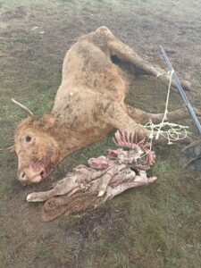 El domingo, 19 de diciembre, otra explotación de Martiago sufría los estragos que le causaban los buitres: una vaca y un ternero muertos. “El lunes por la mañana, me encontré con el desastre y, el domingo, la vaca estaba en perfectas condiciones… para parir, pero totalmente sana y sino, que vengan a ver cómo tengo mis vacas”, apostilla el ganadero afectado.