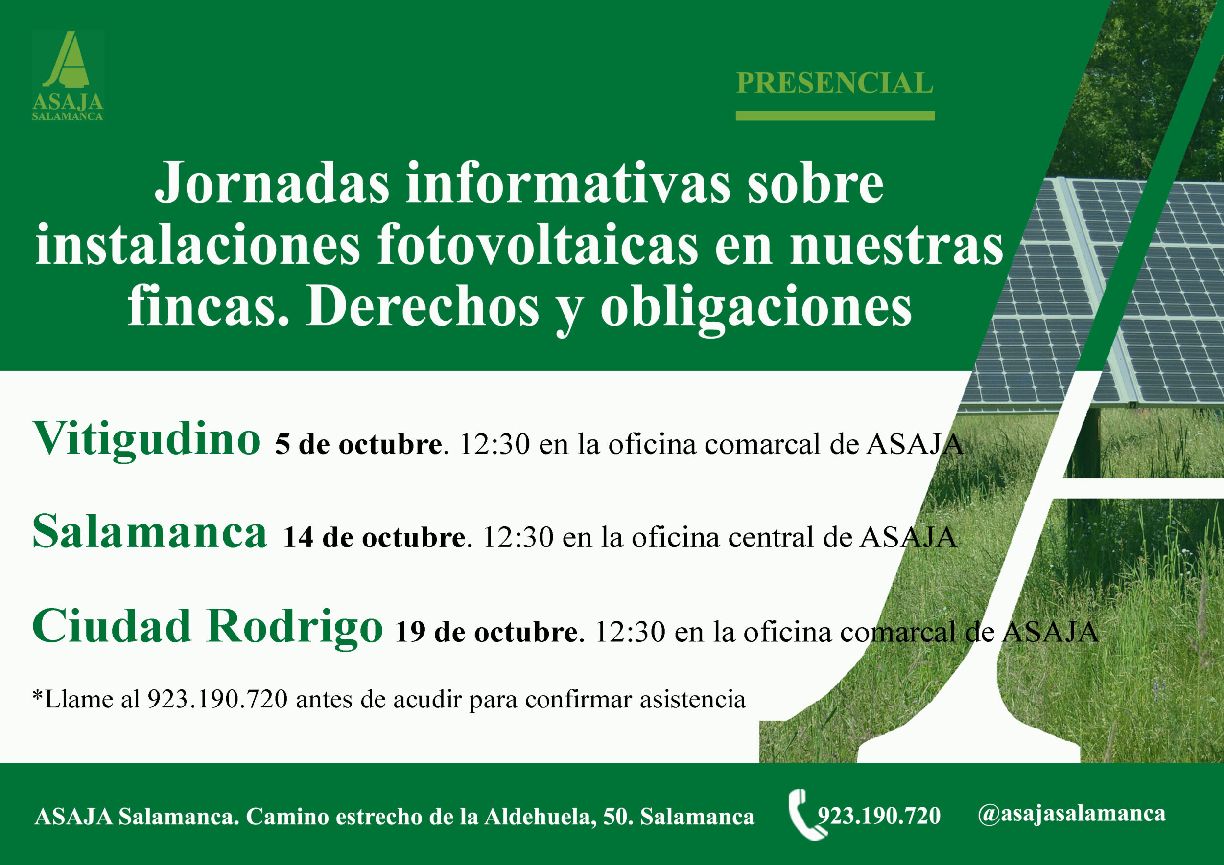 Ante la creciente proliferación del interés de agricultores y ganaderos por uno de los temas más en boga, como las placas solares, ASAJA Salamanca llevará a cabo tres jornadas previstas para este mes de octubre en Vitigudino, Salamanca y Ciudad Rodrigo. En ellas, se tratarán temas legales de la implantación de sistemas fotovoltaicos en las fincas desde un punto de vista jurídico que tiene que ver con los derechos y obligaciones.