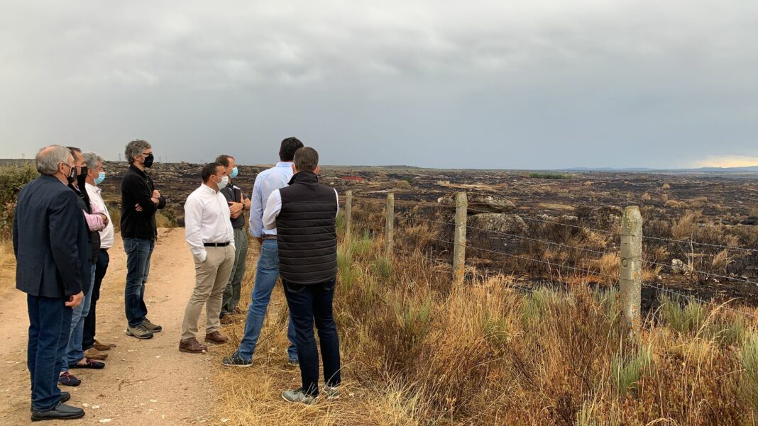 2 de septiembre de 2021| La organización agraria ASAJA de Salamanca acompañó a los ganaderos afectados por los incendios de San Felices de los Gallegos a la visita del delegado territorial de la Junta de Castilla y León en Salamanca, Eloy Ruiz, el miércoles, 1 de septiembre. Más de 1.700 hectáreas arrasadas por el fuego, desde el 18 de agosto, han provocado graves daños a las explotaciones de agricultores y ganaderos; por lo que la OPA trabaja para solicitar, cuanto antes, levantamientos de acotados de pastos para poder alimentar al ganado en extensivo y no tener repercusiones negativas en la PAC.