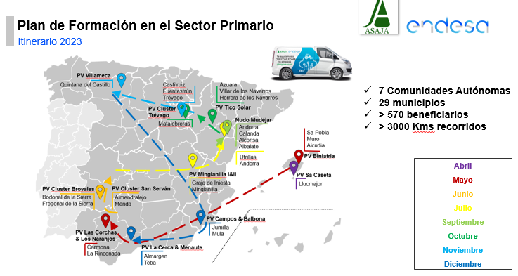 La digitalización del entorno rural llegará de la mano de una iniciativa novedosa como es la “Oficina Móvil de Digitalización Rural”. Se trata de un vehículo en el que formadores de ASAJA recorrerán durante este año 3.000 kilómetros, para visitar un total de 29 municipios del ámbito rural de 7 comunidades autónomas, donde se ubicarán los proyectos renovables de Endesa. Con esta oficina móvil se dará soporte a los agricultores y ganaderos locales para la obtención del Certificado Electrónico de firma digital y orientación en la captación de ayudas y subvenciones. También será un canal de comunicación de los proyectos renovables de Endesa que permita dar a conocer las características de los mismos a la población local.