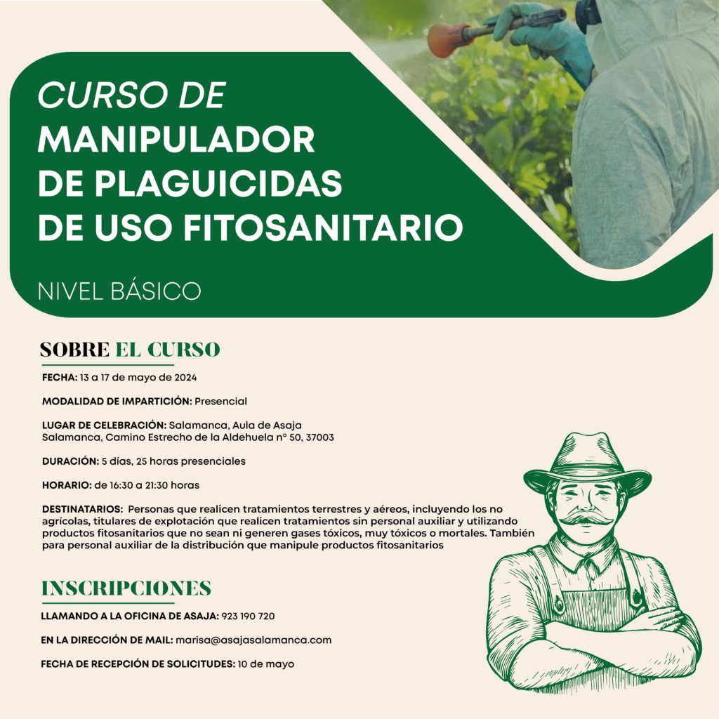 ASAJA Salamanca organiza del 13 al 17 de mayo de 2023 un Curso de manipulador de plaguicidas de uso fitosanitario, nivel básico, con una duración de 25 horas, en jornada de tarde y un total de 25 plazas ofertadas.