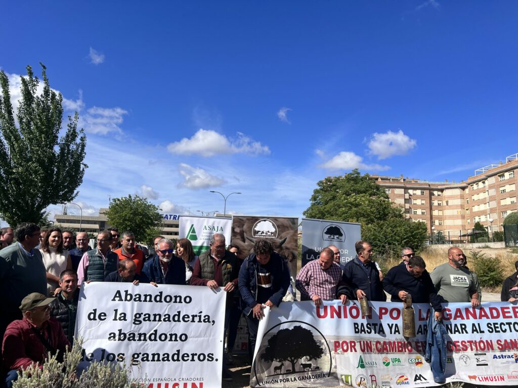 Una centena de ganaderos se reunieron para denunciar «la absoluta inseguridad en la que estamos inmersos, sobre todo, con los problemas sanitarios que nos atraviesan». Además, lo hicieron para exigir al ministro Luis Planas que apoye a a la ganadería extensiva. Ganaderos de Unión por la Ganadería participaron en la protesta, junto a productores de ASAJA Castilla-La Mancha, en la que apuntaron al abandono de la ganadería y de los ganaderos, y también, con la pancarta en la que Unión por la Ganadería, pidieron al ministro un cambio en la gestión sanitaria.