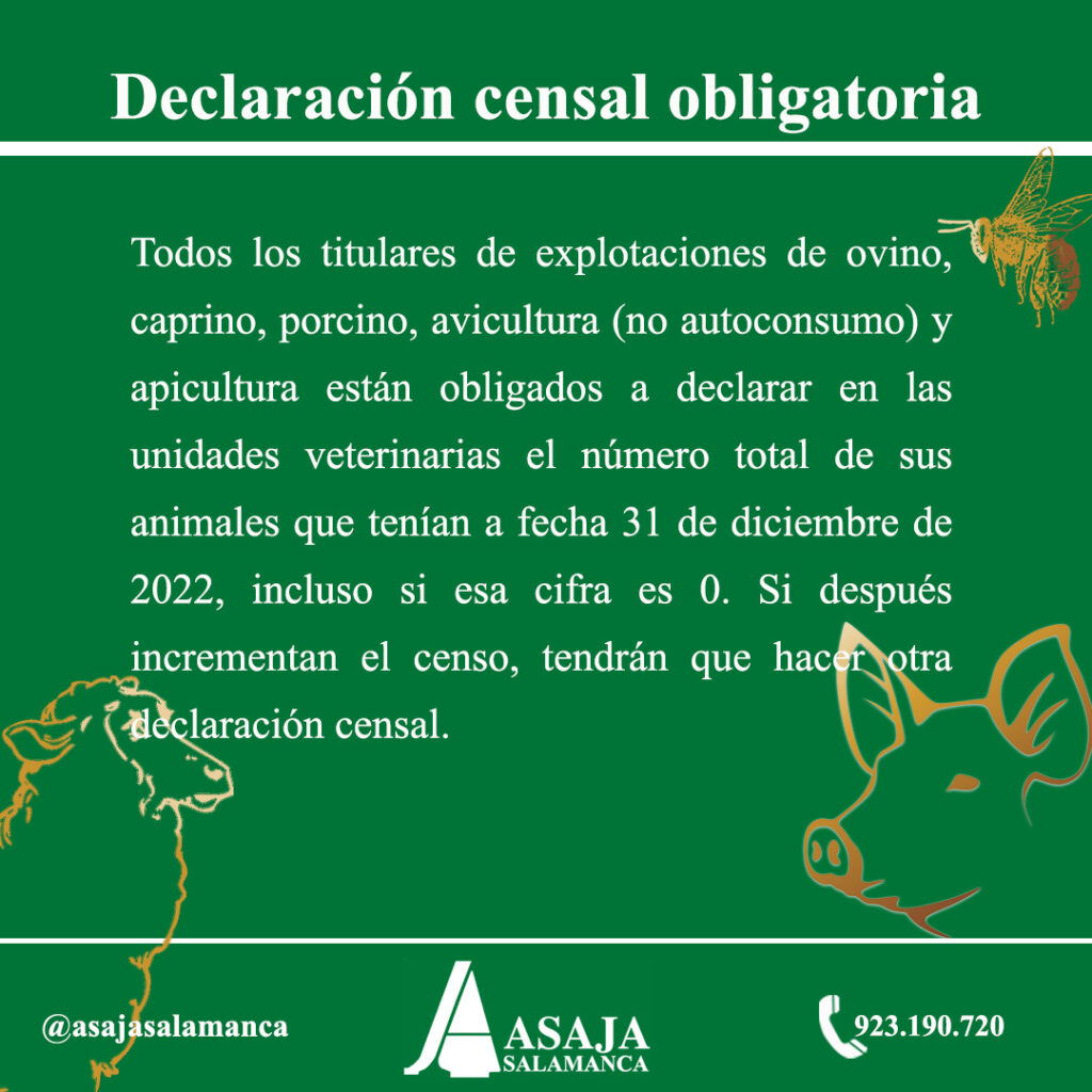 Todos los titulares de explotaciones de ovino, caprino, porcino, avicultura (no autoconsumo) y apicultura están obligados a declarar en las unidades veterinarias el número total de sus animales que tenían a fecha 31 de diciembre de 2022, incluso si esa cifra es 0. Si después incrementan el censo, tendrán que hacer otra declaración censal. El plazo para realizar este trámite finaliza el 28 de febrero.