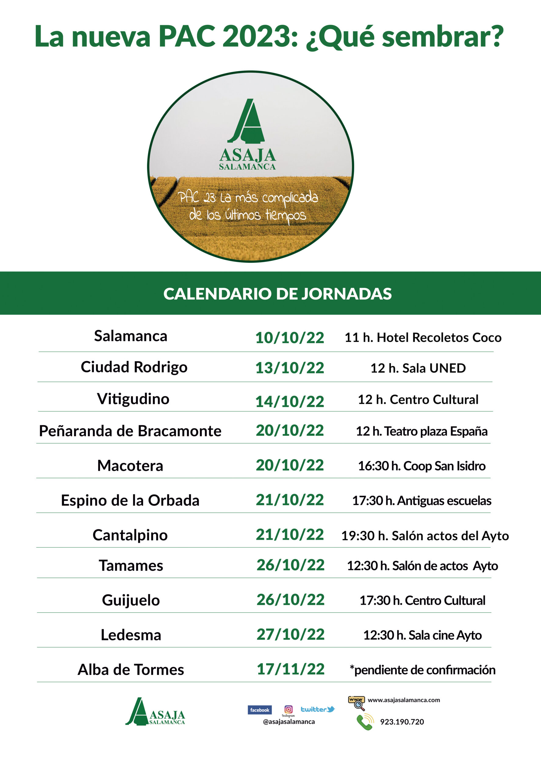 La organización agraria ASAJA Salamanca, debido a la complejidad de la futura PAC, ya impartió la primera jornada en Salamanca el pasado 10 de octubre, pero continuará con estos encuentros por toda la geografía salmantina, según fuentes de la OPA. La próxima cita será este viernes, 14 de octubre en Vitigudino, a las 12 horas en el centro cultural.
